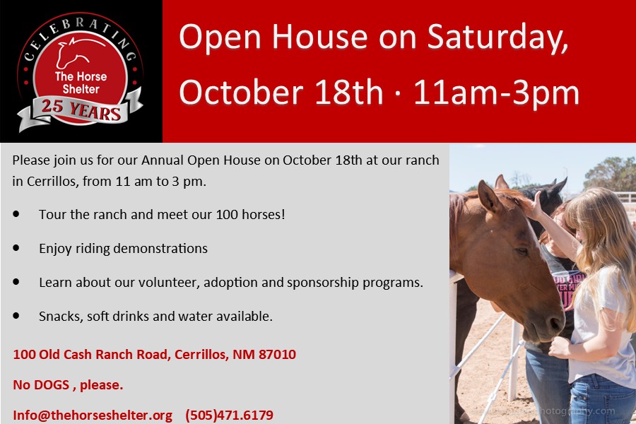 Home We rescue abused, abandoned, and neglected horses throughout New Mexico. Sponsor A Rescue Our New Intakes Need Sponsors Name: Chai Gender: Mare Color: Sorrel Breed: Grade Age: 8 Chai Name: Elise Gender: Mare Color: Palomino Breed: Grade Age: 20 Elise Name: Herbie Gender: Gelding Color: Sorrel Breed: Grade Age: 23 Herbie Name: Inigo Montoya Gender: Gelding Color: Bay Breed: Grade Age: 18 Inigo Montoya Name: Pagan Gender: Gelding Color: Sorrel Breed: Grade Age: 2 Pagan Name: Pascal Gender: Gelding Color: Bay Breed: Grade Age: 2 Pascal Name: Paul Revere Gender: Gelding Color: Bay Breed: Grade Age: 1 Paul Revere Name: Pharoah Gender: Gelding Color: Bay Roan Breed: Grade Age: 2 Pharoah Adopt Find your riding or companion horse today. Donate Together we can give rescue horses a better life. Volunteer You do not need horse experience to volunteer! Shop Shop at or donate to the Horse Shelter Resale Store. Open House 2025 Summer Newsletter Shop our Resale Store to support our horses