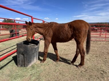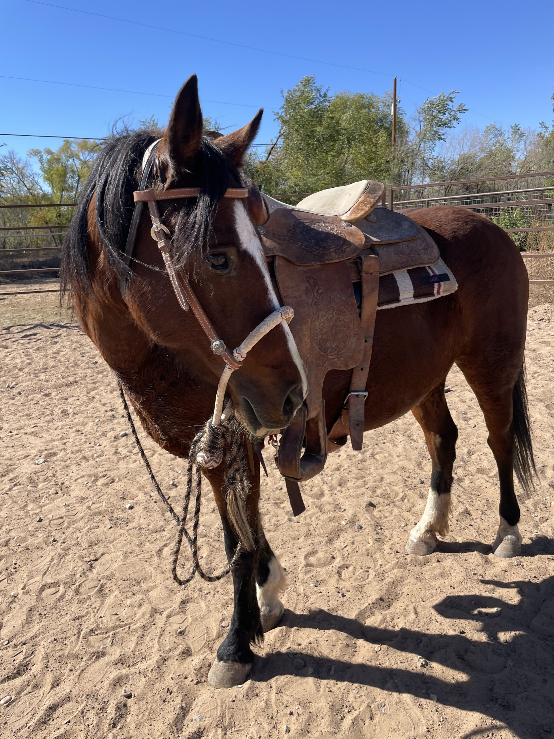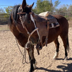 In progress! Iris is a cute, stout little gal that came to us through NMLB as a stray. Iris stands for the vet and farrier, loads in the trailer quietly, and enjoys being brushed. She is early in her saddle training but seems to be progressing well.