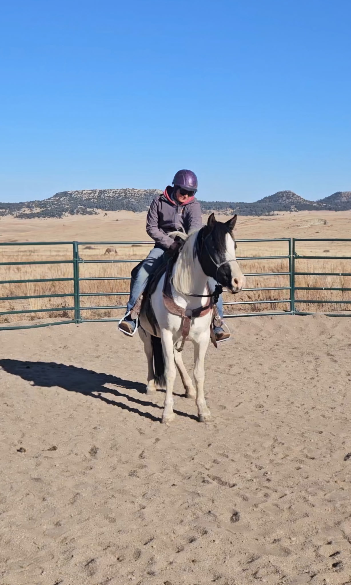 In Progress! Natilla is a lovely pinto mare that was born here at THS. She has been shy her whole life and is wary of new people and things. Natilla is working with a professional trainer and has had a handful of rides. Natilla will be available for adoption as a riding horse later in 2026 and will require a very experienced rider who can show her patience and help her when she struggles. Riding Level: Advanced.